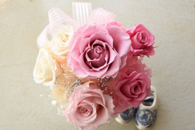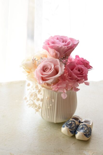 九州におられる息子さんが入籍されたので、「結婚式の前に送ってあげたい」とお母様からプリザーブドフラワーのご注文をいただきました。お色味をお聞きしたところ「お任せします」とのことでしたのでピンクとホワイトでまとめてみました。